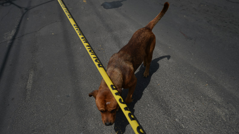 - Un perrito estuvo presente cuando Medicina Legal retiraba el cadáver del lugar. Foto EDH/ Jonatan Funes