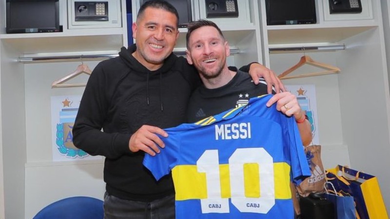 El encuentro se disputó en La Bombonera, estadio de Boca Júniors, y ahí estaba Juan Román Riquelme, histórico del Boca, y quien le llevó un regalo a Messi, una camiseta con su nombre pero de los colores xeneizes.