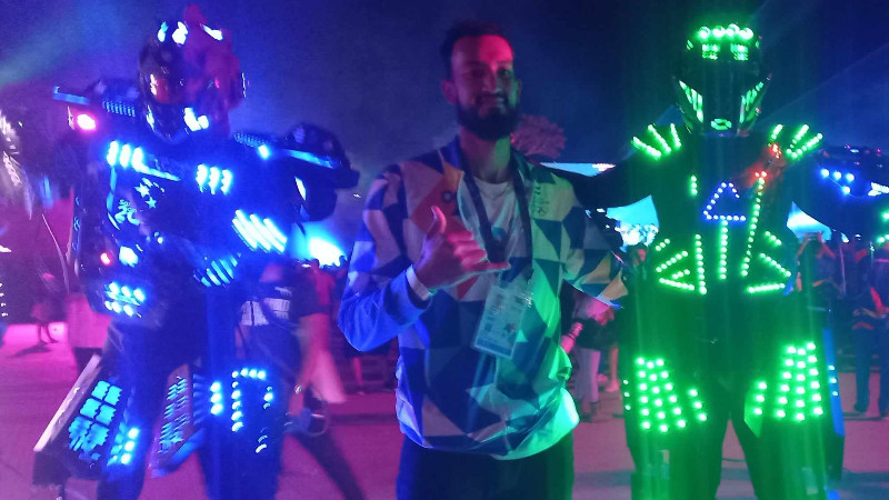 Aguilar se la pasó muy bien e incluso compartió con unos robots "gigantes" que estuvieron en el evento. Estos estuvieron a la altura del basquetbolista, y Aguilar al fin encontró a alguien de su estatura en la clausura.