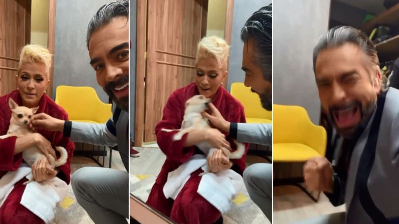 En el corto se ve a Chaparro con la cantante Yuri, quienes se han vuelto a unir para la nueva temporada del programa “¿Quién es la máscara?”. La famosa “güera” tiene en sus brazos a su perrita chihuahua y el actor se acerca para acariciarla.