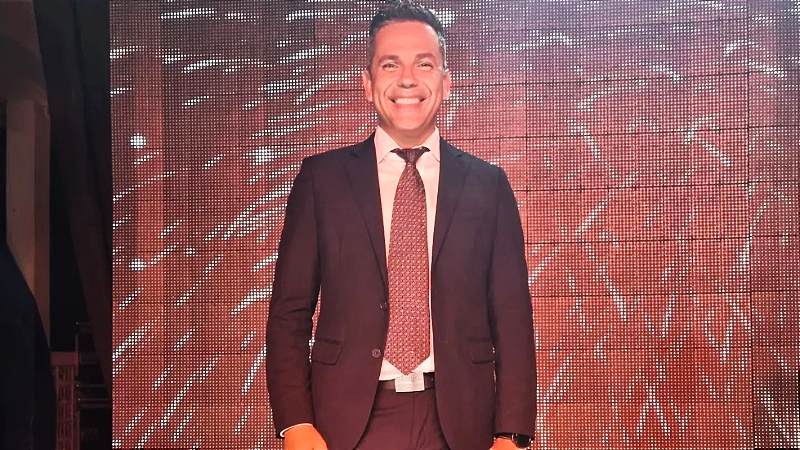 En la imagen se ve a Acosta sobre un escenario, con una sonrisa de oreja a oreja y teniendo de fondo a una multitud de personas que llegaron al evento (sin precisar cuál).