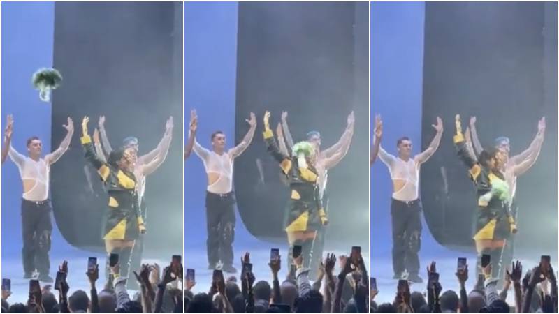 Tras finalizar la coreografía de una de sus canciones durante un espectáculo que ofreció en San Diego, California, una persona que estaba en planea le lanzó el ramo al escenario con tanta fuerza que por mala suerte le pegó.