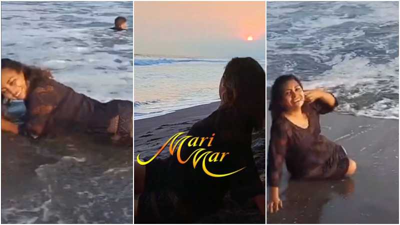 El contenido está editado con las famosas letras que caracterizan la telenovela Marimar, mientras nuestra imágenes de la tiktoker acostada en la playa viendo el atardecer, de fondo suena el tema oficial de novela mexicana.