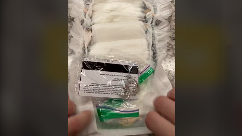 Ella guarda varios objetos como una tarjeta de crédito en una bolsa hermética para posteriormente enrollarla con un pañal limpio y lo sella con las cintas adhesivas que trae consigo.