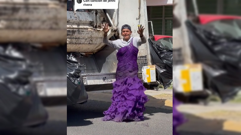 Un joven trabajador del sistema de aseo en México fue captado por las cámaras de la cuenta de TikTok, @johny.garciaa, mientras trabajaba utilizando un vestido morado, la escena recibió un gran apoyo.