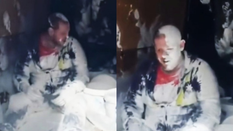 Esto le sucedió al desafortunado hombre que iba encerrado en la parte de atrás de la furgoneta y que desató la risa que sus compañeros cuando se dieron cuenta de cómo él se eoncontraba. El trabajador esta sentado, sin decir palabra alguna y cubierto completamente de pintura blanca.
