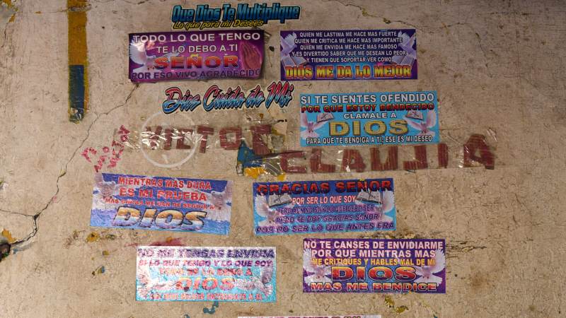 - Algunas paredes poseen stikers con mensajes, posiblemente en este espacio había un puesto de artículos cristianos o simplemente la persona que ocupaba el espacio le gustaban los stikers con mensajes de fe. Foto EDH/ Menly Cortez