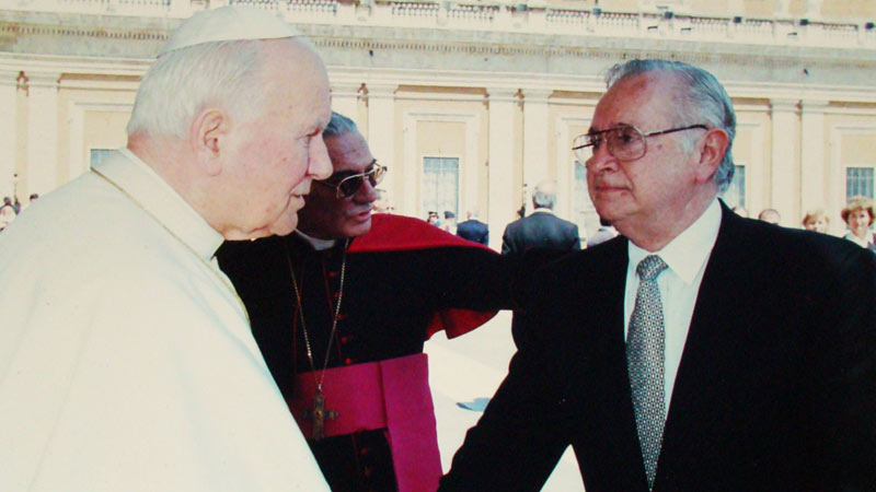 - Eserski durante una visita al Vaticano con el papa Juan Pablo Segundo. El visionario empresario expresaba en vida que su fe era parte importante de su piedra angular como empresario. Foto EDH/ cortesía