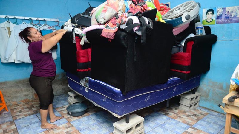 “Siempre se ha desborda el río, yo me preparo para cuando empiece a crecer el río, en minutos el río crece y no da tiempo para salvar nada”, comentó Maria Campos, mientras acomodaba ropa sobre la cama que está colocada sobre ladrillos. Foto EDH/ Jessica Orellana