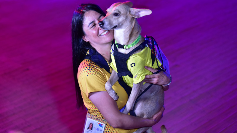 "Colombo llegó a nuestro edificio. Por ahí dicen que los perros lo buscan a uno. Estaba muy temeroso y lo vacunamos. Le hicimos examen de sangre, vimos que estaba bien de salud. Eso nos llevó a una cosa, nos empezamos a enamorar y él más de Patricia (fisoterapista de la delegación), contó a prensa de los Juegos, una de los miembros de la delegación colombiana. Foto EDH/Jonatan Funes
