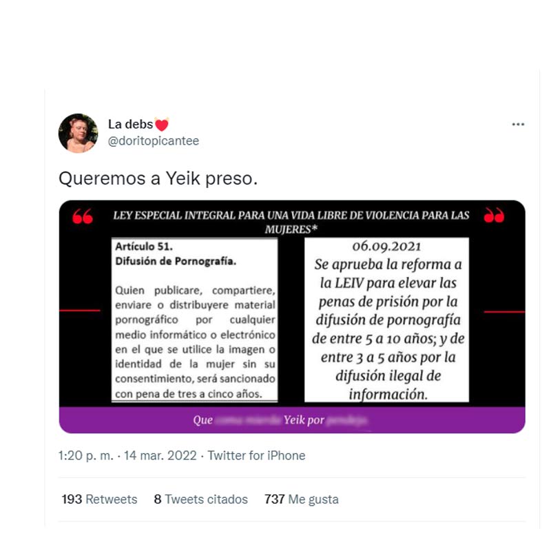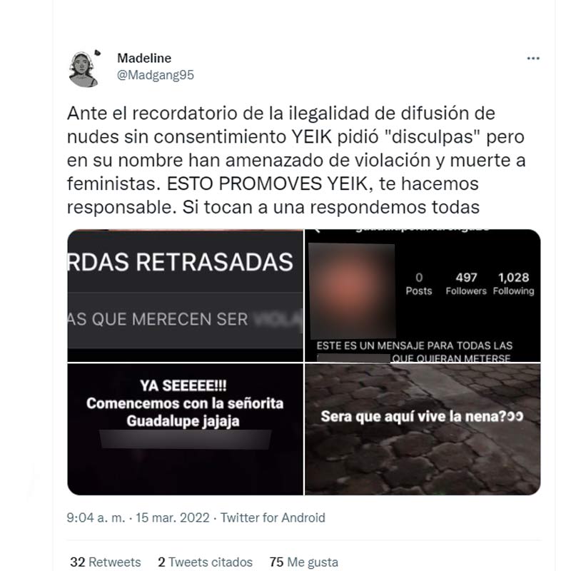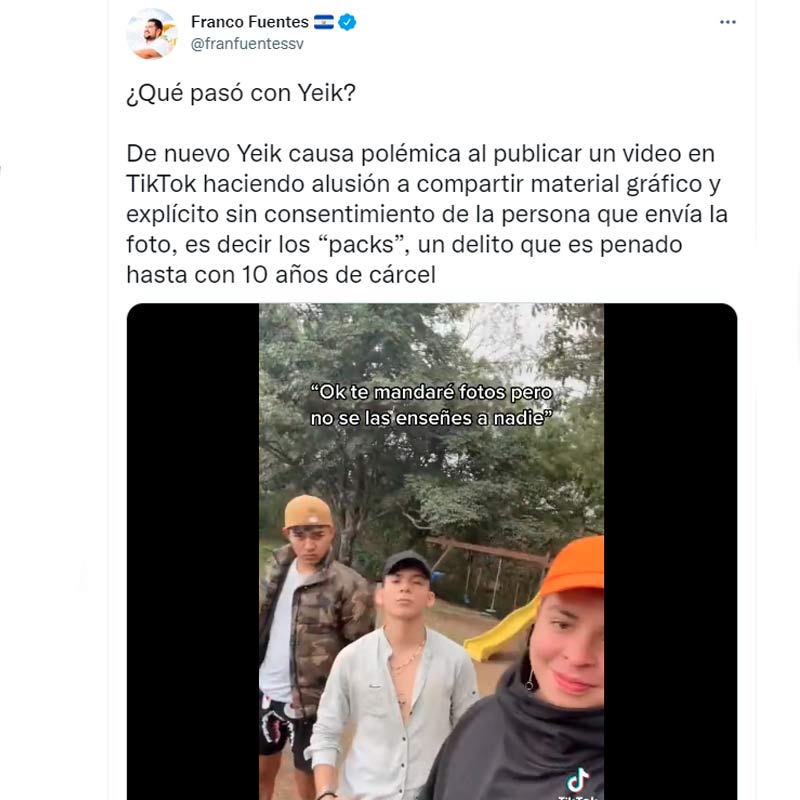 Luego de que Yeik publicara un video en el que hace alusión a compartir imágenes sin consentimiento de la persona que envía la foto, varias cuentas de Intagram y WhatsApp de mujeres que lo denunciaron fueron hackeadas con amenazas a muerte, violación y seguimiento en residencias. Esto ha generado que usuarios de redes sociales se muestren indignados y pidan un proceso penal contra el salvadoreño.