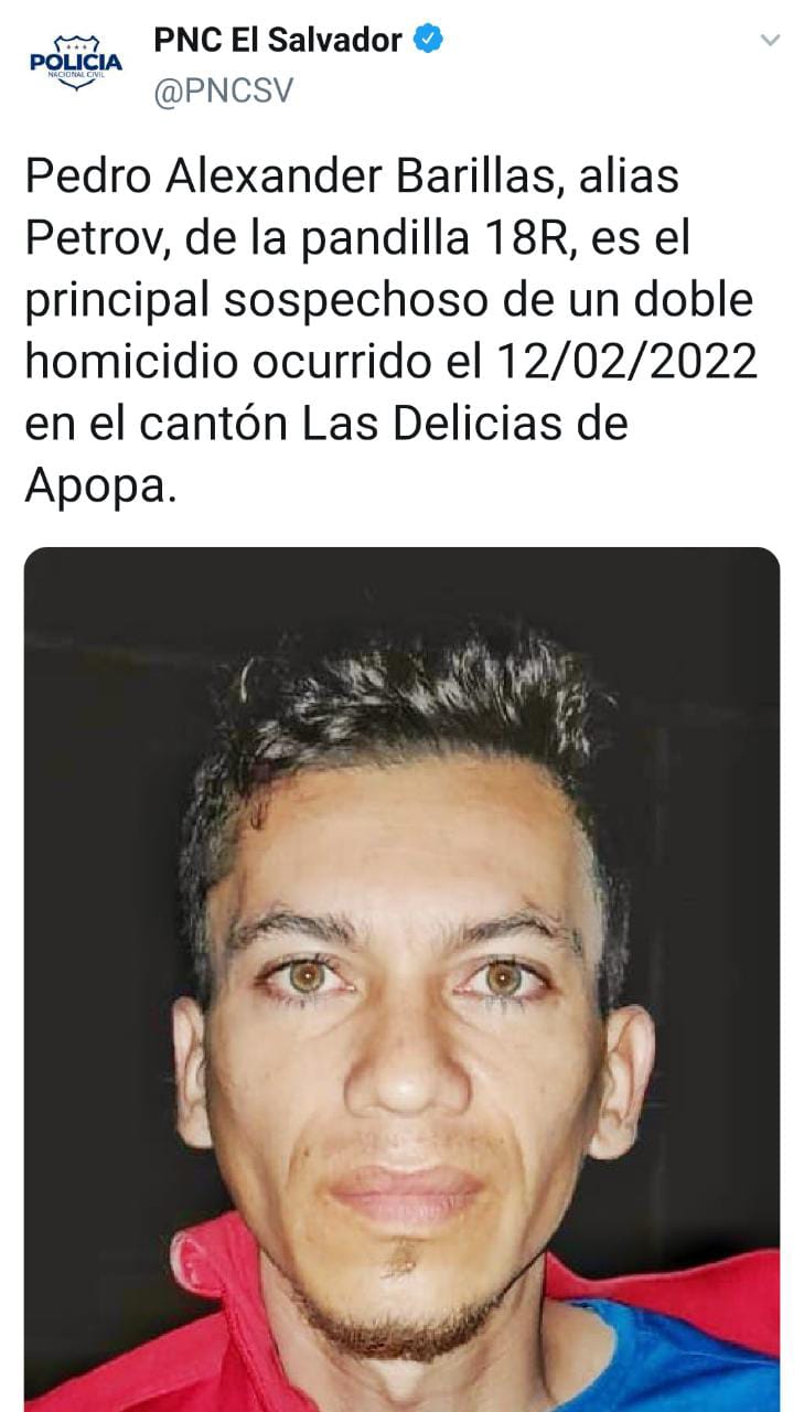 - La Policía reportó la captura de Pedro Alexander Barillas, alias Petrov, por el doble homicidio en Apopa. Foto EDH/ Cortesía PNC.