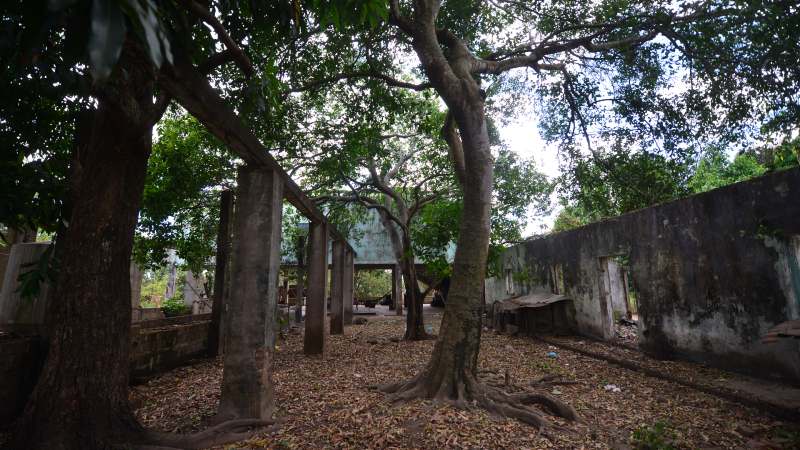 - La estructura donde estaban las bodegas, oficina siguen en pié, atrás se ubicaba la casa de los dueños de la hacienda Santa Catalina, pintada en color verde. Foto EDH/Yessica Hompanera