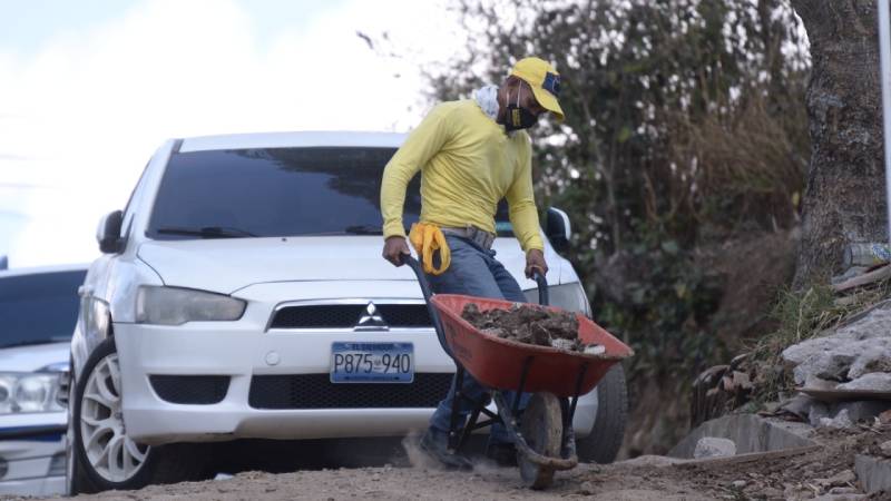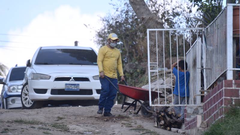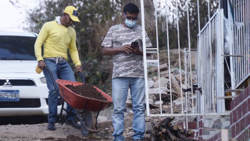 - Dos reos en fase de confianza trabajan sacando tierra y ripio del interior de la vivienda. Foto EDH/ Francisco Rubio