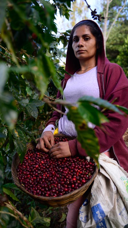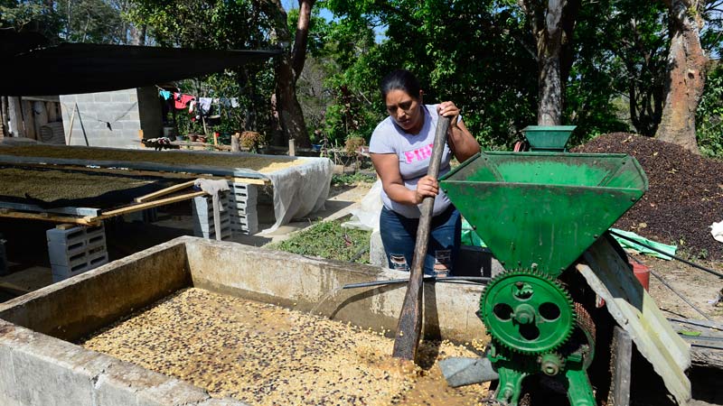- Rosa Magaly Ochoa, de 26 años, corta café en la Finca Mileydi, aprendió desde pequeña con sus padres y al día hace más de 10 arrobas desde las 7 del mañana hasta las 3 de la tarde. Foto EDH/ Jessica Orellana