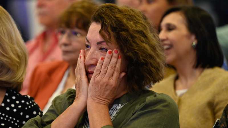 Myrna Argueta, madre del astronauta de origen salvadoreño Frank Rubio, quien realiza una misión al espacio, observa en pantalla el lanzamiento de la nave rusa Soyuz MS-22. El evento se desarrolló en Casa Presidencial.