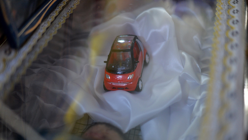 - El sueño de Geovani era tener un vehículo propio para trabajar, por lo que la familia colocó un carrito de juguete en su ataúd. Foto EDH/Jonatan Funes
