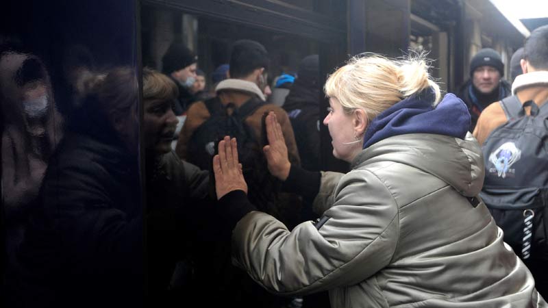 - Una mujer se despide cuando un tren con evacuados está a punto de salir de la estación de tren de Kiev el 2 de marzo de 2022. Rusia intensifica su campaña de bombardeos y ataques con misiles en las ciudades de Ucrania el 2 de marzo de 2022. Foto AFP