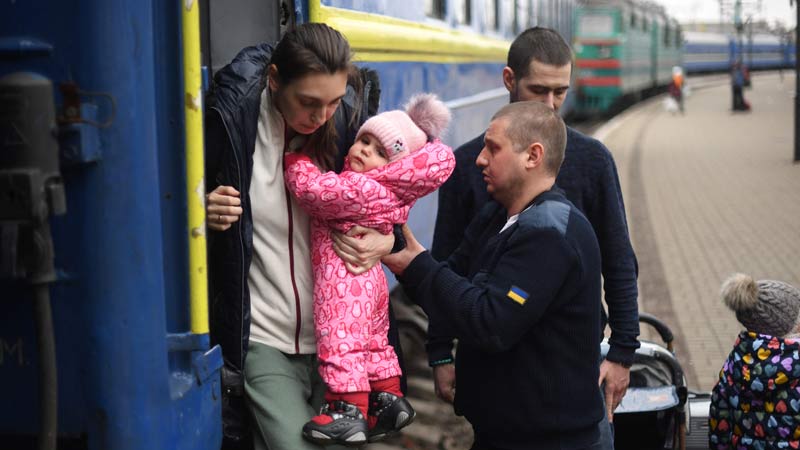 - Una mujer sostiene a su hijo cuando llega de Odessa a una estación de tren en Lviv, al oeste de Ucrania. Las fuerzas rusas tomaron la ciudad ucraniana de Kherson, confirmaron funcionarios locales el 2 de marzo de 2022, el primer gran centro urbano a caer desde que Moscú invadió hace una semana. Foto AFP