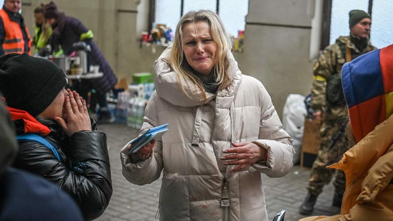 - Una mujer llora mientras intenta abordar un tren gratuito a Polonia en una estación de tren en Lviv.Foto AFP