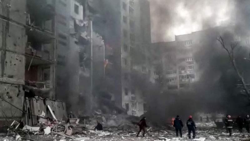 - Esta imagen tomada de un video publicado por el Servicio Estatal de Emergencia de Ucrania muestra un edificio de apartamentos dañado que, según se dice, fue atacado por bombardeos en Chernihiv el 3 de marzo de 2022. Foto AFP