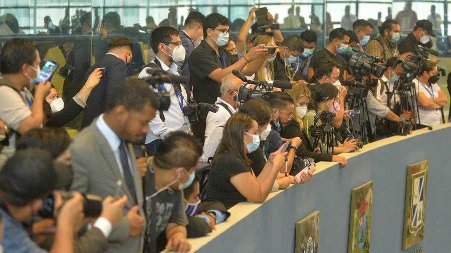 - La prensa local se aglomeró en la parte superior del salón azul. Foto EDH/ René Quintanilla
