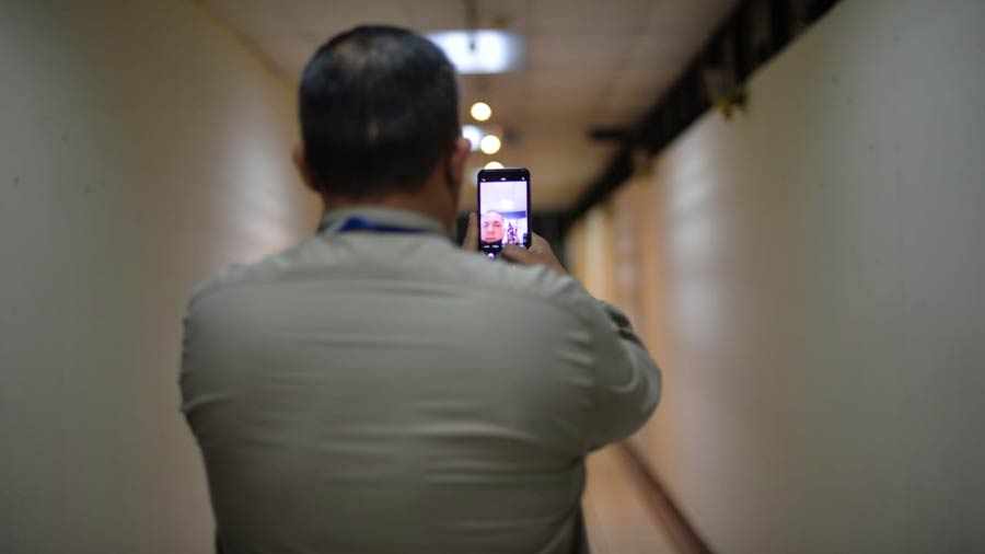 - Un empleado de la Asamblea Legislativa se toma una fotografía en los pasillos de la Asamblea antes de que lleguen todos los diputados. Foto EDH/ Jonatan Funes