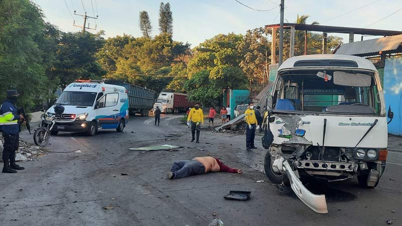 - El motorista de esta unidad de transporte murió debido a la gravedad de las lesiones, el 10 de abril 2022, sobre la Troncal del Norte. Uno de los cinco pasajeros necesitó ser trasladado a un hospital, mientras que el resto fue atendido en el lugar del percance. Foto EDH/ Jonatan Funes
