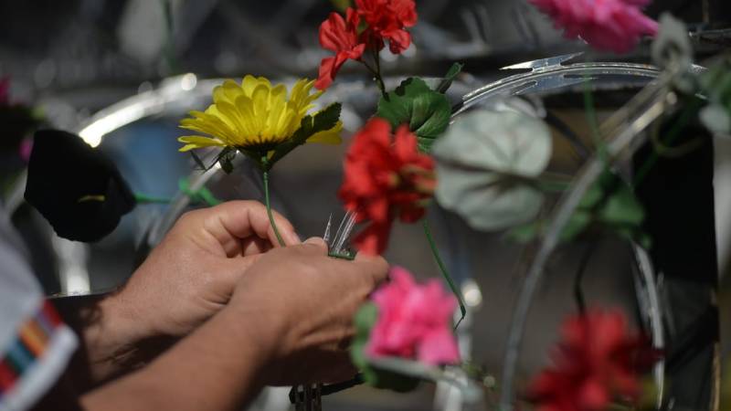 - Los manifestantes colocaron flores plásticas en la barricada instalada por agentes de la UMO. Foto EDH/ Jonatan Funes