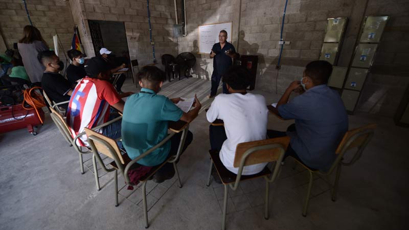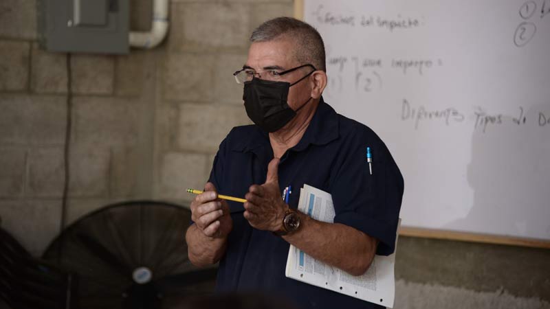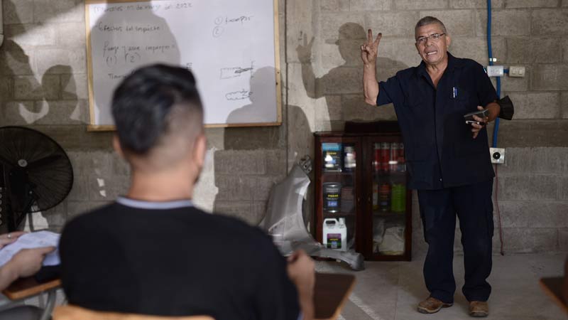 Óscar es un mecánico que imparte las clases en el taller de enderezado y pintura en Soyapango a jóvenes que buscan superarse y aprender.