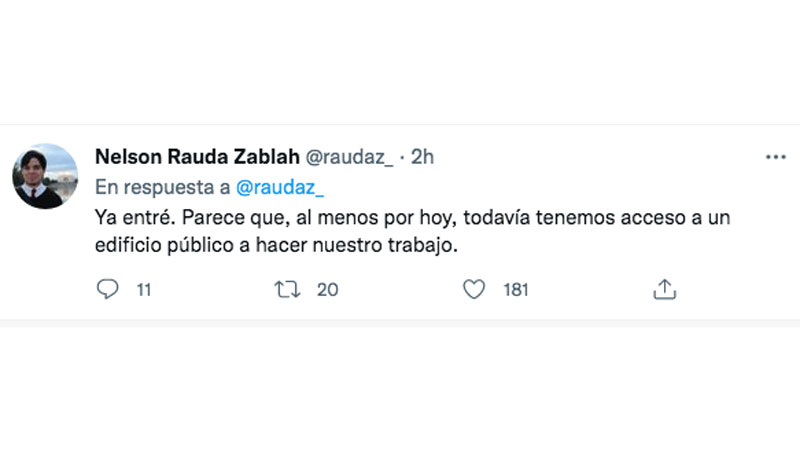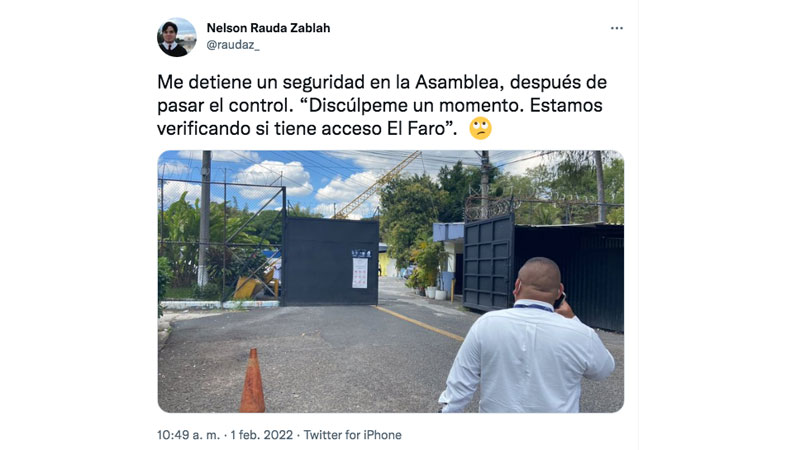 - Nelson Rauda, periodista de El Faro, denunció en su cuenta Twitter: "Me detiene un seguridad en la Asamblea, después de pasar el control. “Discúlpeme un momento. Estamos verificando si tiene acceso El Faro”. Fotografía de carácter ilustrativo y no comercial. https://twitter.com/raudaz_/status/1488555035365572611?t=yKfZXC9U0SaZR97DDtIsQA&s=08