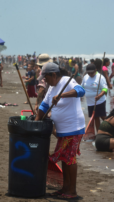 - En medio del bullicio del medio día, hay un grupo de mujeres con camisas blancas que con pinzas y un basurero caminan por toda la playa con el objetivo de mantenerla limpia, tarea que se hace difícil debido a la cultura que tiene los visitantes de estos centros turísticos. En la zona tampoco se pueden observar basureros o cárteles que promuevan el ornato. Foto EHD/Yessica Hompanera
