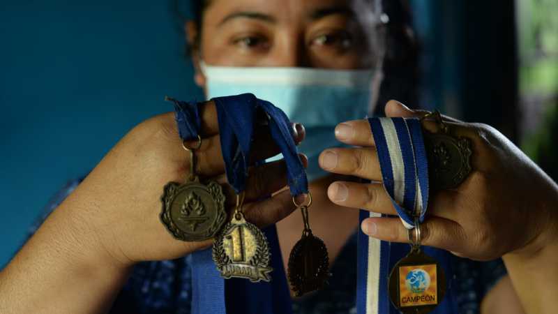 Doris muestra las medallas ganadas por su hijo Kevin en diferentes torneos de fútbol.