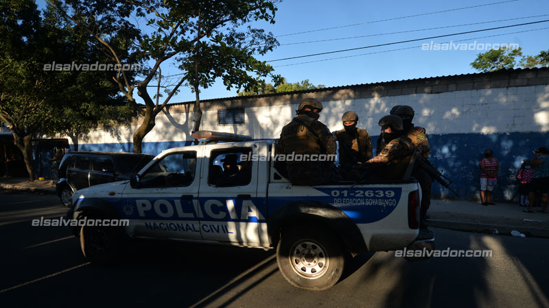 - Patrulla policial con soldados recorre la calle principal en el límite de Montes de San Bartolo IV y V, Soyapango. Foto EDH