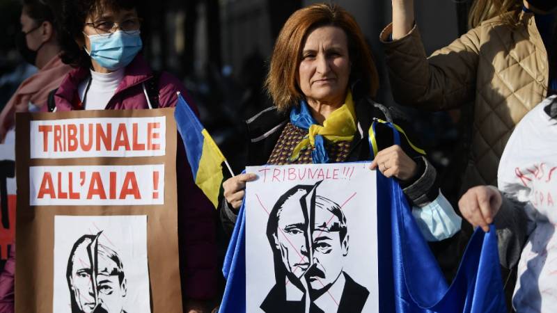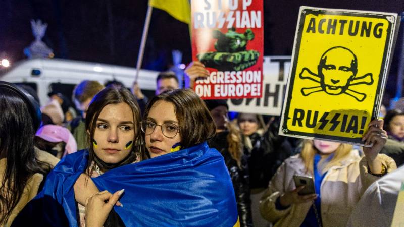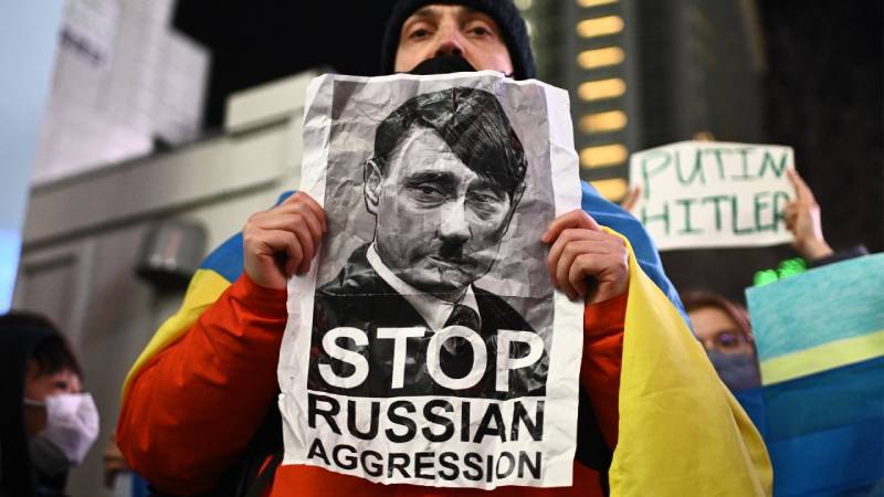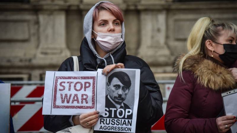 - Manifestantes de Polonia toman parte de la protesta mundial en contra de las acciones de Rusia. Foto Agencia AFP