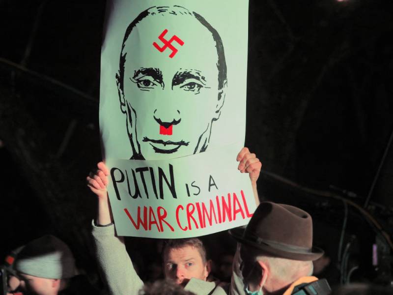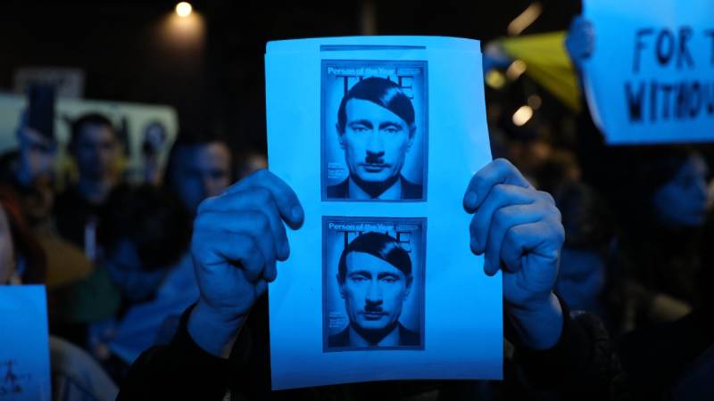 - Un hombre sostiene el retrato del Presidente Vladimir Putin con el bigote de Adolf Hitler enfrente de la embajada rusa en Rumania. Foto Agencia AFP