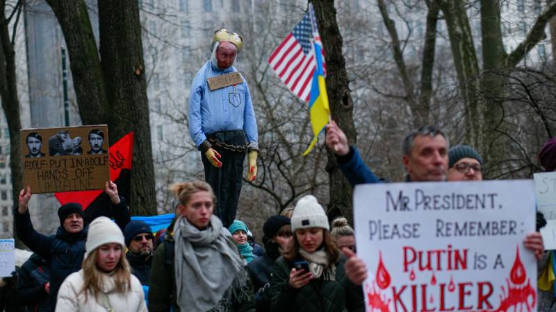 - En Nueva York también se unieron al repudio a las acciones militares de Rusia en contra de Ucrania. Foto Agencia AFP