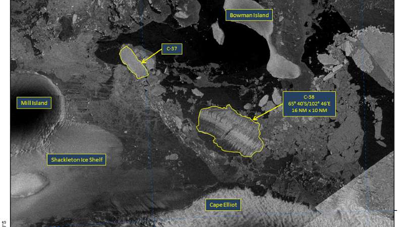 Según el Centro Nacional del Hielo, la agencia estadounidense que vigila el hielo flotante, la desintegración de esa plataforma dio lugar a un témpano de casi 30 km de largo y 18 km de ancho, llamado C38, que luego se rompió en dos pedazos.