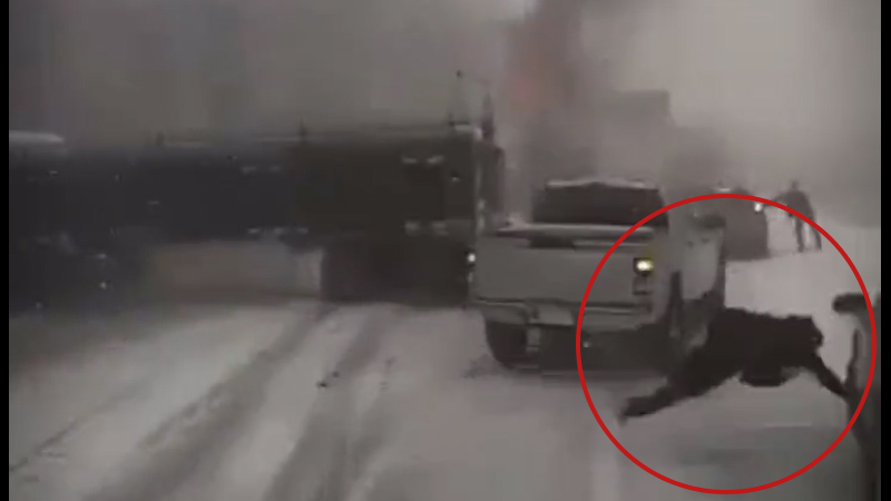 Una cámara de video de un camión grabó el momento en el que una de las personas que se encontraba en la carretera se salva en el último segundo, antes de ser atropellada y quedar atrapada entre los coches.