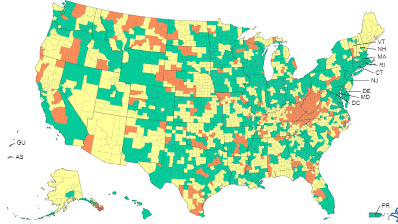 En el mapa se pueden observar con color naranja aquellos condados que posean altos niveles de covid-19, con amarillo los medios, y de color verde aquellos que se reportan cifras bajas de contagios.