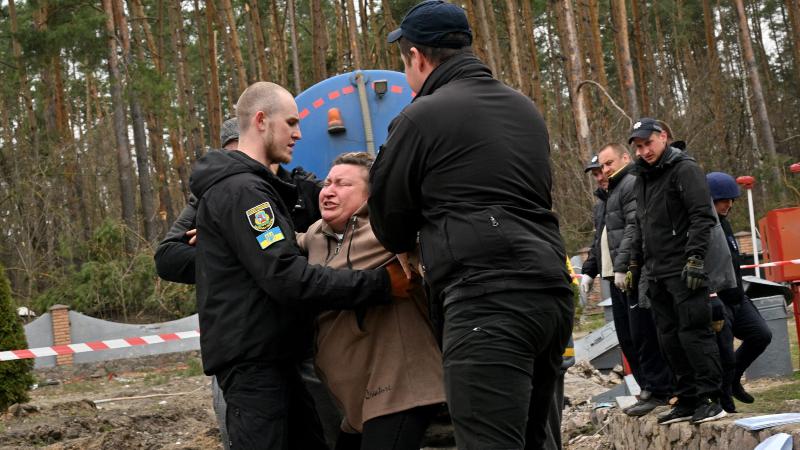 Una madre implora ver el cuerpo de su hijo Evgueni, de 23 años encontrado en la fosa común, posterior a la retirada de las tropas rusas en Buzova.