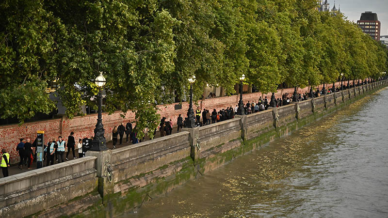 Las largas filas de británicos que están esperando su turno para ver el féretro de la reina Isabel II se extiende varios kilómetros al lado del río Thames hasta la entrada del Parlamento