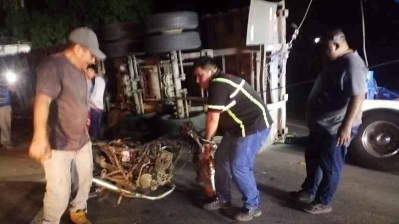Según información de la Policía, la causa fue la imprudencia del motociclista al invadir el carril, fueron embestidos por una rastra por más de 15 metros.