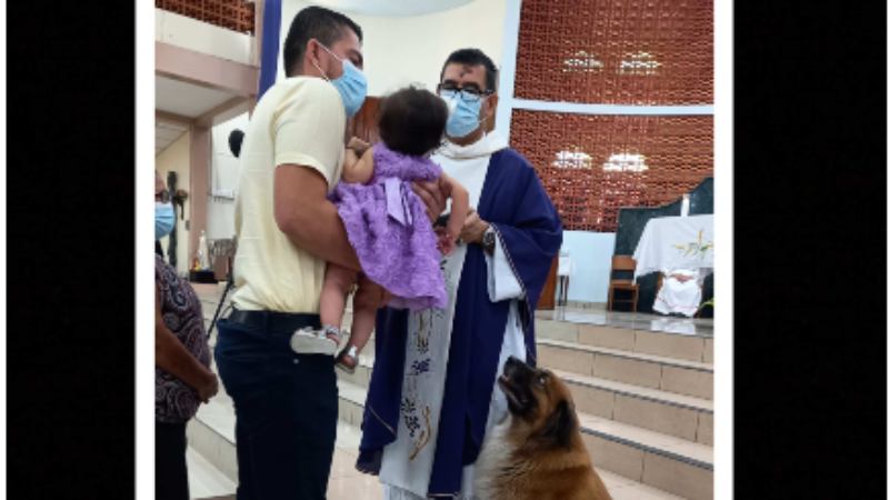 Jack, el amigo inseparable del padre Henry González durante las misas en parroquia de San Miguel