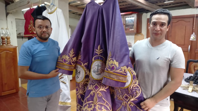Este Viernes Santo las imágenes de pasión y de compañía, de al menos unas 12 parroquias del país, serán ataviadas con túnicas elaboradas en el Taller de bordados La Merced, ubicado en el barrio Yusique de Chinameca, en San Miguel, bajo la dirección de Juan Carlos Campos quien cuenta con 27 años de experiencia en el arte de confección y bordado de vestimenta religiosa.