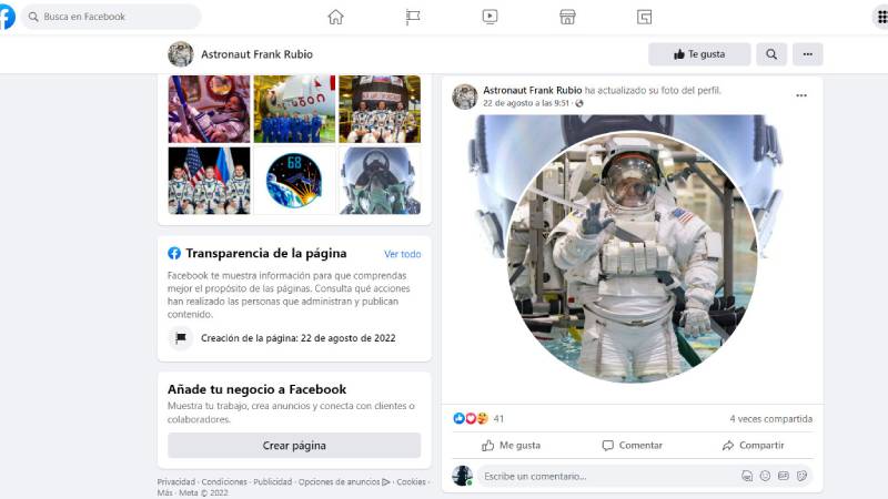 Astronaut Frank Rubio | Facebook es la página que se encuentra en la plataforma de Facebook, fue creada el 22 de agosto donde suben videos y fotografías de Rubio y los dos cosmonautas rusos que viajarán el miércoles 21 de septiembre hacia la Estación Espacial Internacional (EEI) a bordo de la nave Soyuz MS-222 el vuelo sale desde el cosmódromo de Baikonur, en Kazajistán.