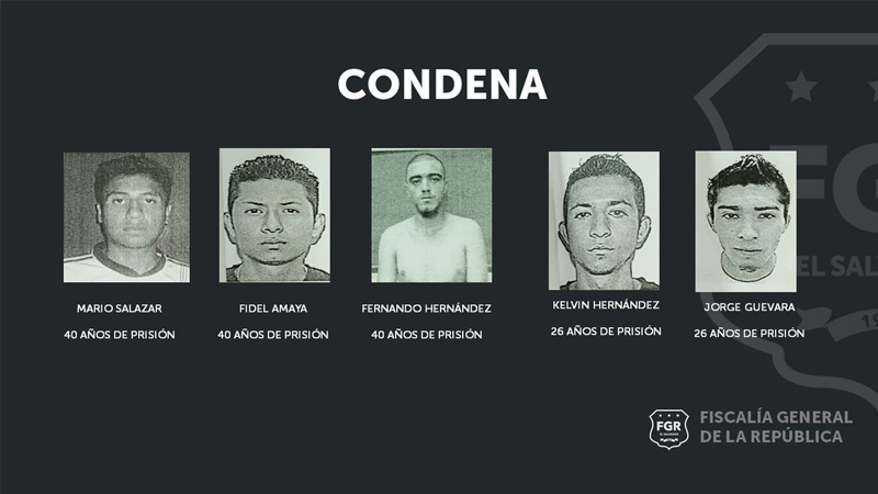 Cinco miembros de la Mara Salvatrucha (MS-13) de la clica Delicias Locos Salvatruchas (DLS) fueron sentenciados a penas de prisión de entre 26 y 40 años, por el asesinato de un agente de la Policía Nacional Civil (PNC) cometido a finales de agosto de 2017, en el centro de la ciudad de Santa Tecla, departamento de La Libertad.