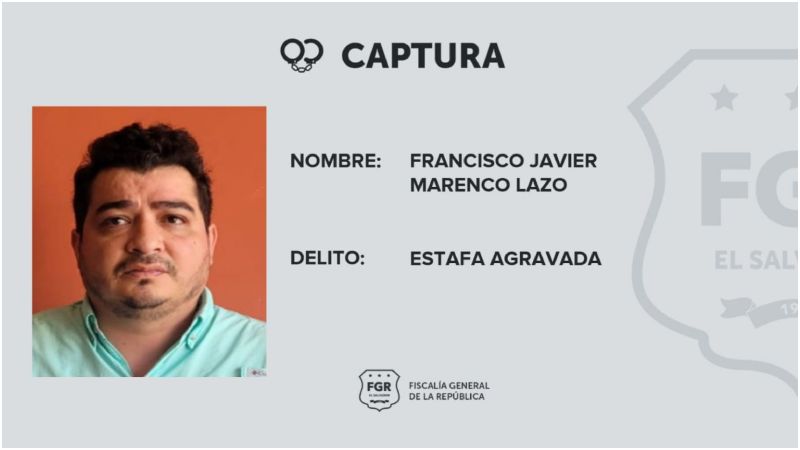 Francisco Javier Marenco Lazo fue capturado por una orden de la Fiscalía General de la República ya que se le acusa de estafar a más de 11 víctimas, en San Salvador.