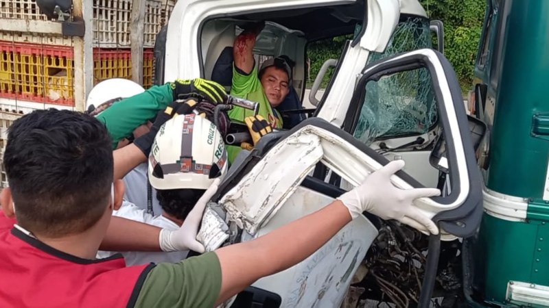 Un hombre resultó quedó atrapado en el camión que viajaba como copiloto y tres personas más resultaron lesionadas, luego que un camión colisionara contra la parte trasera de un bus de la ruta 102, sobre el kilómetro 28, de la carretera al Puerto de La Libertad, en La Libertad.