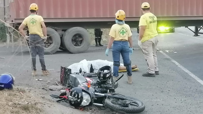 Una mujer murió y un hombre resultó lesionado, la mañana de este jueves, al chocar la moto en la que se conducían contra una rastra, en la calle antigua a Mariona, reportaron socorristas de Comandos de Salvamento.